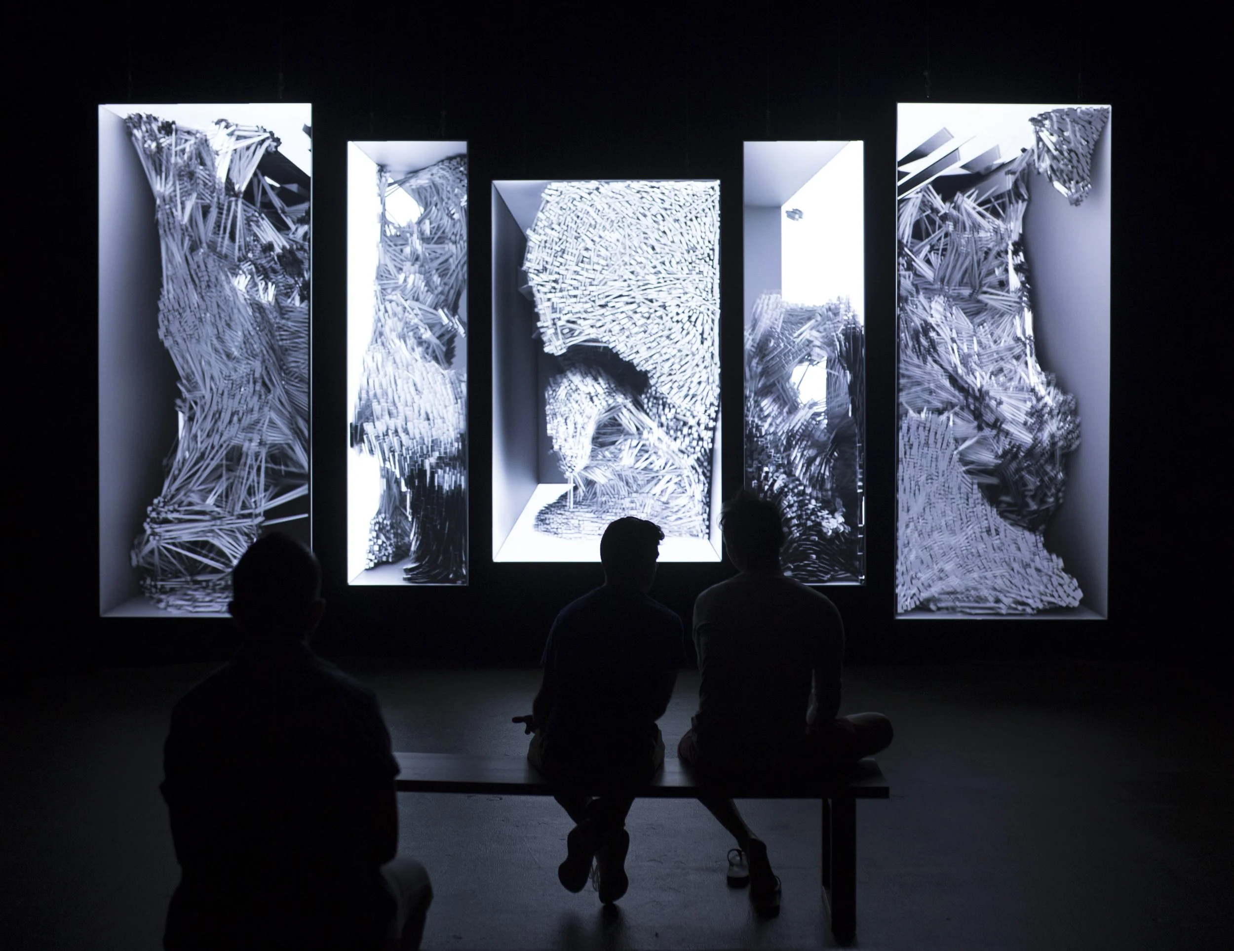 The artwork is an abstract narrative that travels through the different states of matter, distorted physical laws, and hypothetic physical simulations.